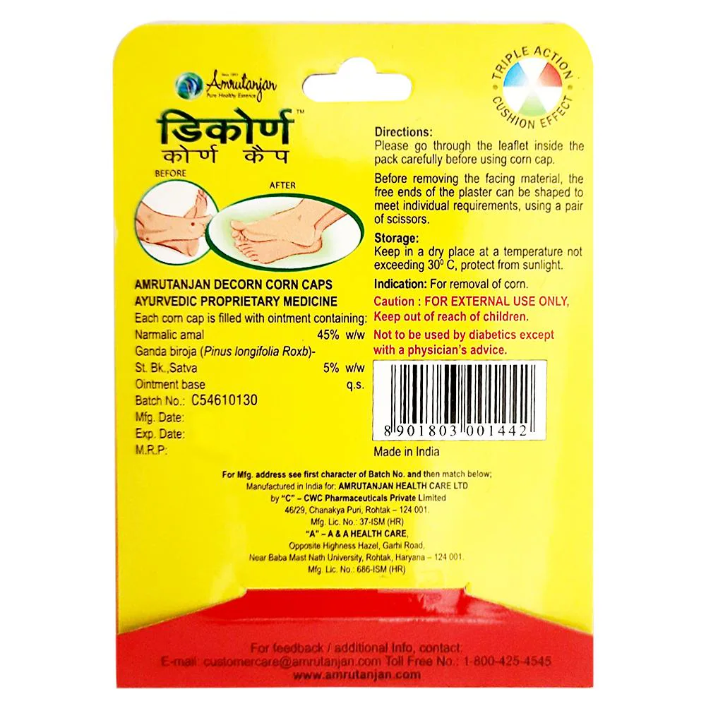 Amrutanjan Decorn corn caps are ayurvedic medicine for corn removal in foot. It is quick acting and comes in easy to use bandage. Its soothing effect gives long lasting relief. Its quick action helps in achieving soft feet and removes corn effectively. It is completely natural, safe to use and has no side effects.