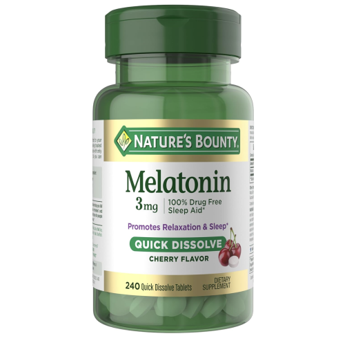 Nature’s Bounty Melatonin 3mg is your trusted partner for a restful night’s sleep, offering a 100% drug-free solution to support relaxation and aid sleep.(1) Melatonin is a naturally occurring hormone, Nature’s Bounty melatonin works harmoniously with your body’s sleep cycle.(1) This 3 mg melatonin formula is particularly beneficial for those experiencing occasional sleeplessness or seeking a reliable nighttime sleep aid.(1) Designed for your convenience, these quick-dissolve tablets dissolve in just 30 seconds under your tongue and feature a natural cherry flavor that you will love. With 240 count per pack, they provide support for your occasional sleeplessness needs.(1) Nature’s Bounty Melatonin 3 mg are formulated to meet a variety of dietary preferences. Thay are free from gluten, dairy, and wheat, and are also suitable for vegetarians. Nature’s Bounty Melatonin 3mg is the sleep aid solution to staying asleep longer.(1) By choosing this supplement, experience one of the best sleep aids to support your journey toward restful healthier sleep.(1)
